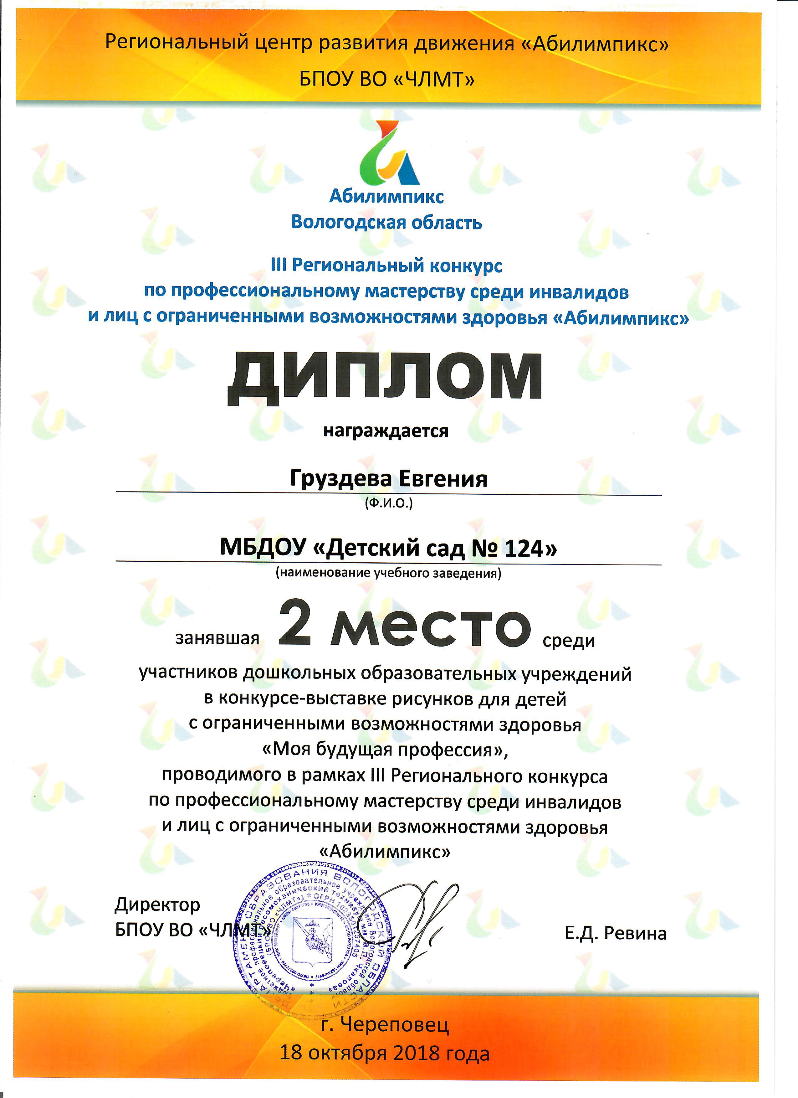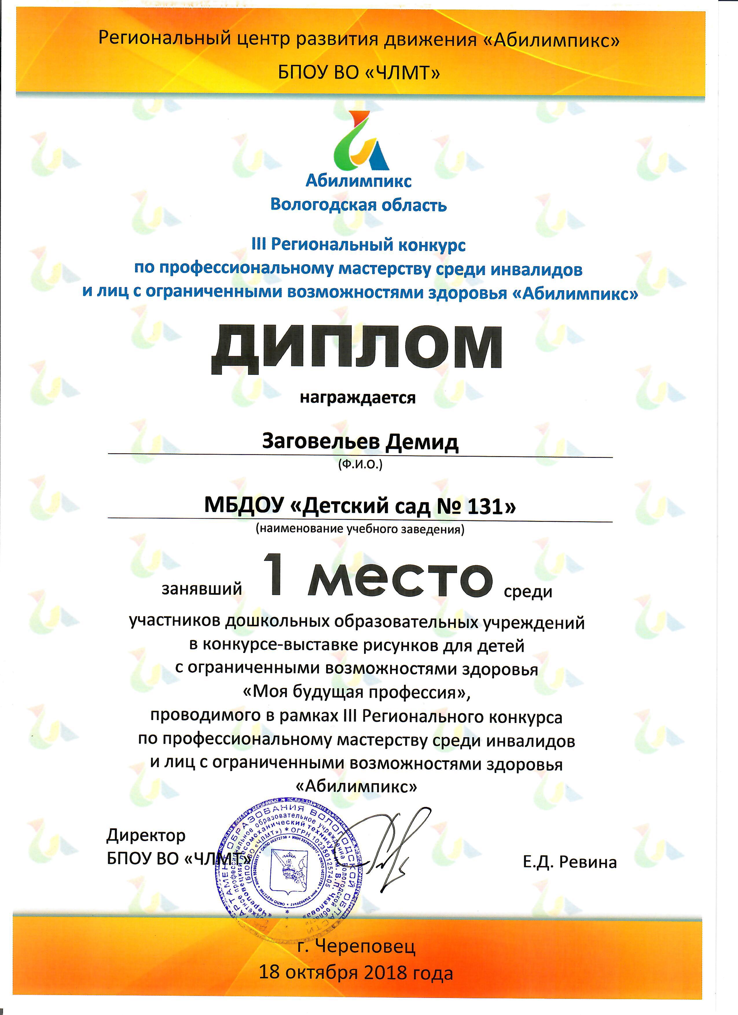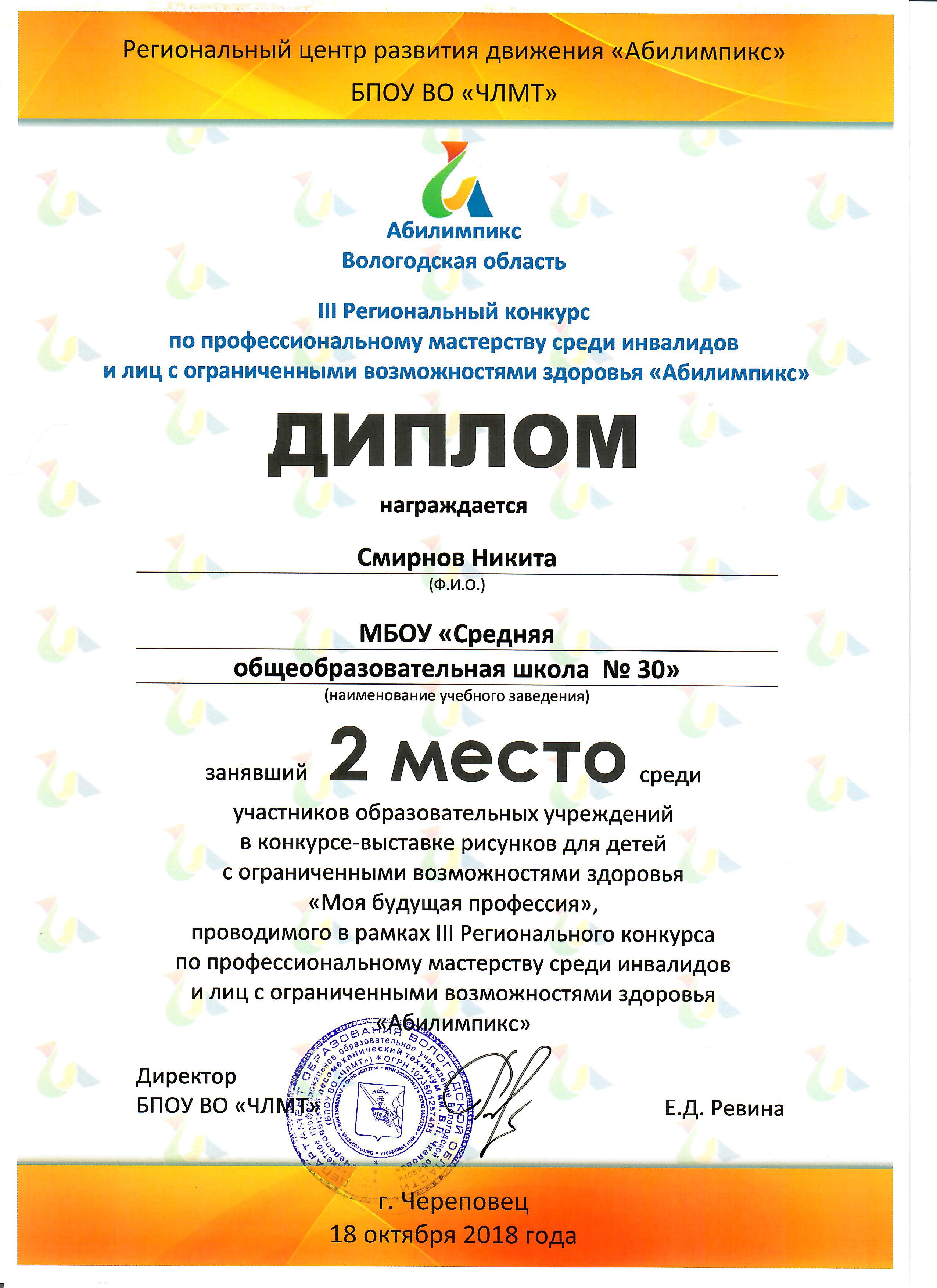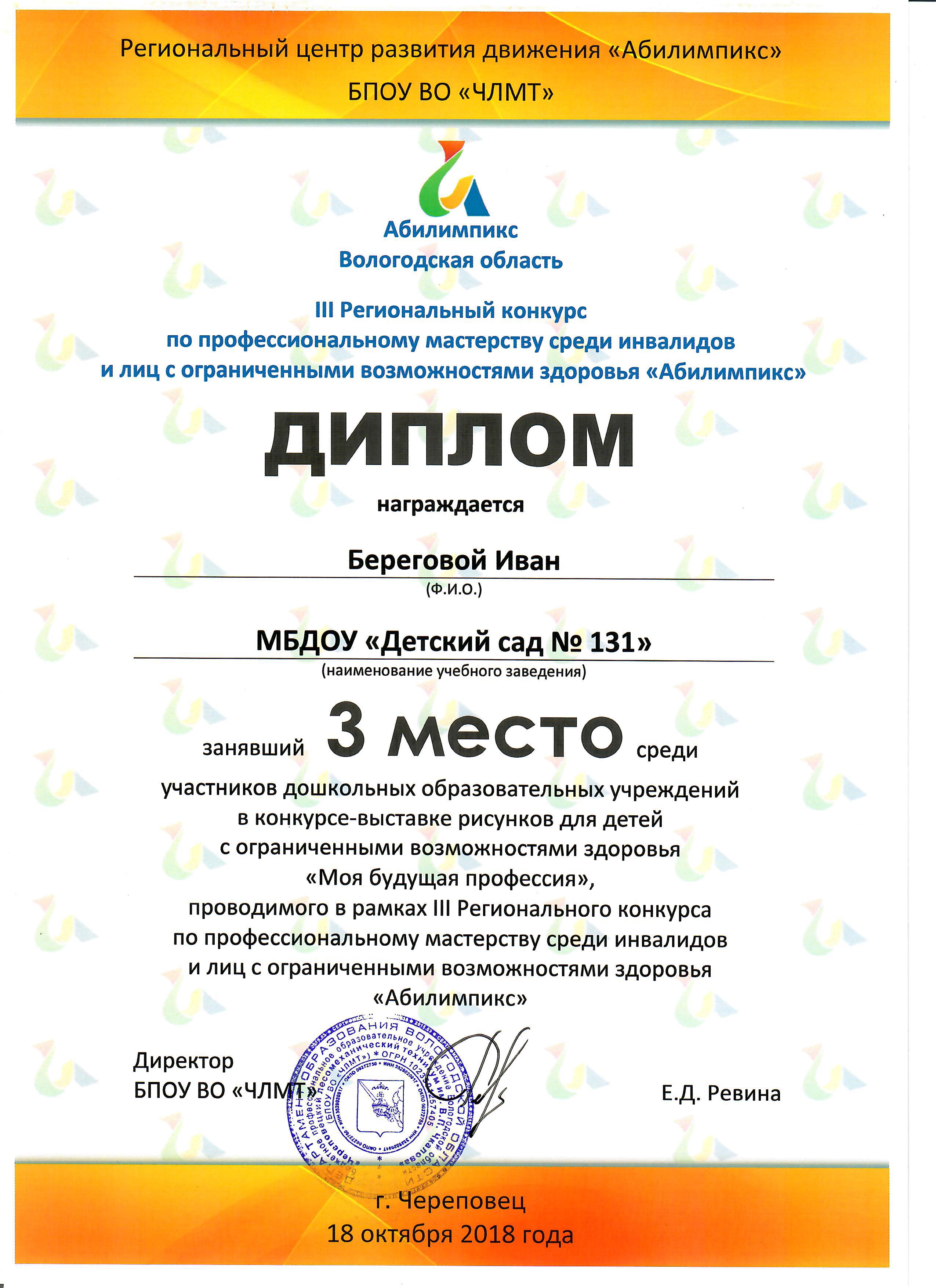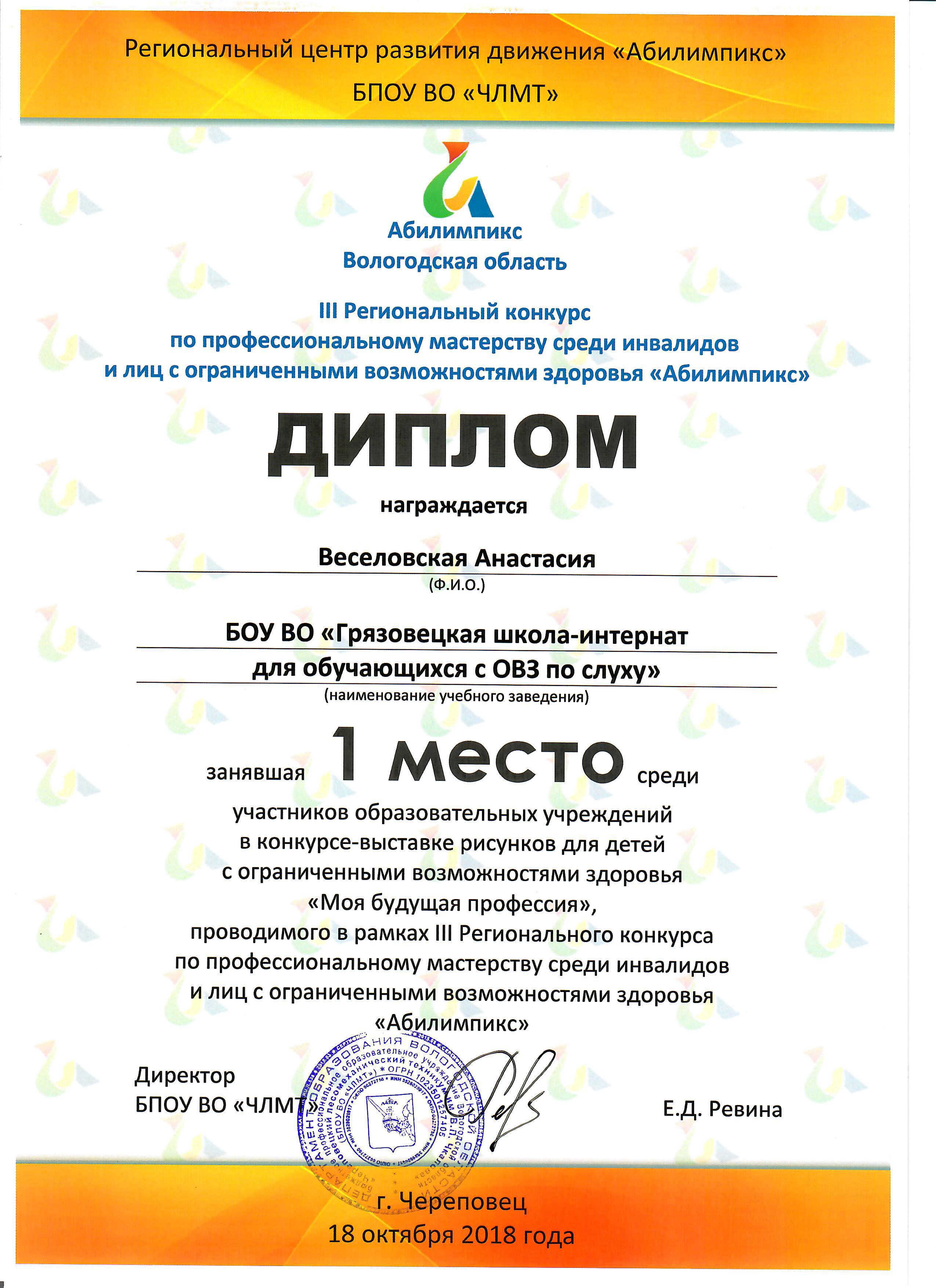 1 ноября 2018 года представители БПОУ ВО «Череповецкий лесомеханический техникум им. В.П.Чкалова» в рамках Региональной межведомственной конференции «Жизнь без барьеров: актуальные вопросы помощи детям и молодежи с ограниченными возможностями здоровья» наградили победителей конкурса-выставки рисунков для детей с ограниченными возможностями здоровья «Моя будущая профессия». Конкурс-выставка рисунков был организован в рамках III Регионального конкурса по профессиональному мастерству среди инвалидов и лиц с ограниченными возможностями здоровья «Абилимпикс», которой прошел в г.Череповце 17-18 октября 2018 года.