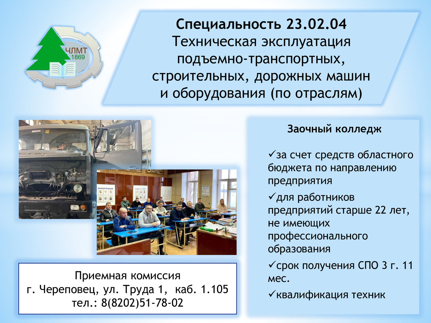 Череповецкий лесомеханический техникум продолжает набор на ЗАОЧНОЕ ОБУЧЕНИЕ НА БЮДЖЕТНОЙ ОСНОВЕ по специальности 23.02.04 Техническая эксплуатация подъемно-транспортных, строительных, дорожных машин и оборудования (по отраслям) на базе 9 КЛАССОВ!