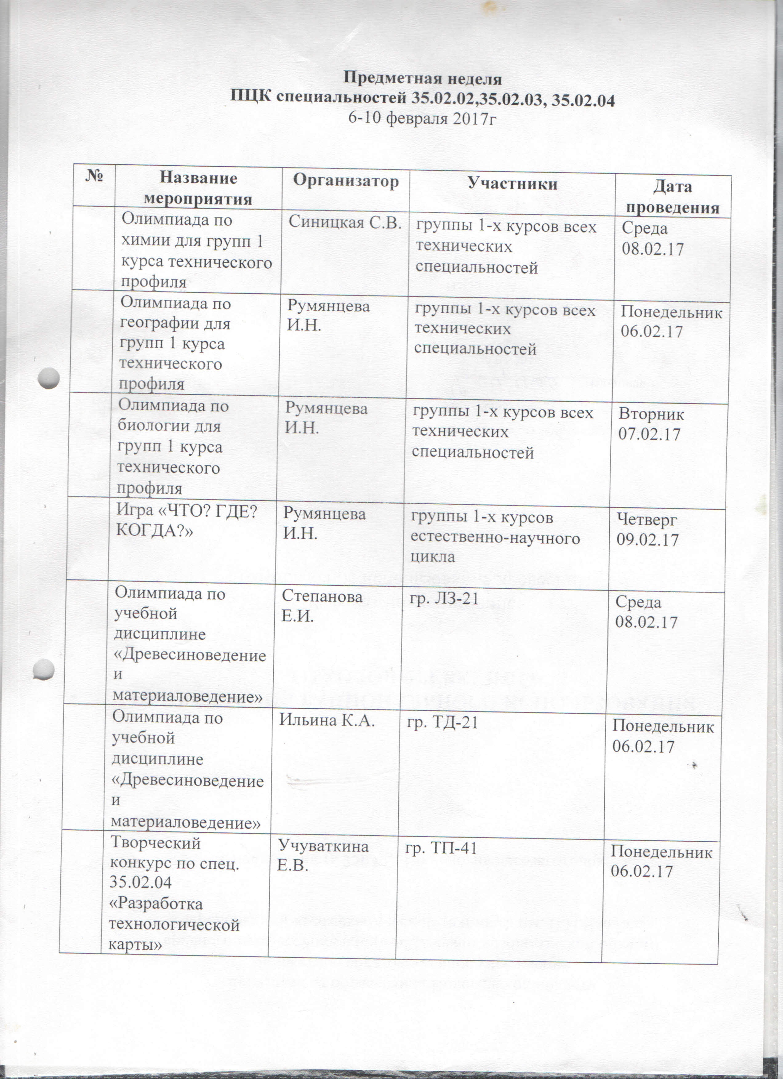 С 6 по 10 февраля 2017 года пройдет Предметная неделя ПЦК специальностей 35.02.02, 35.02.03, 35.02.04.