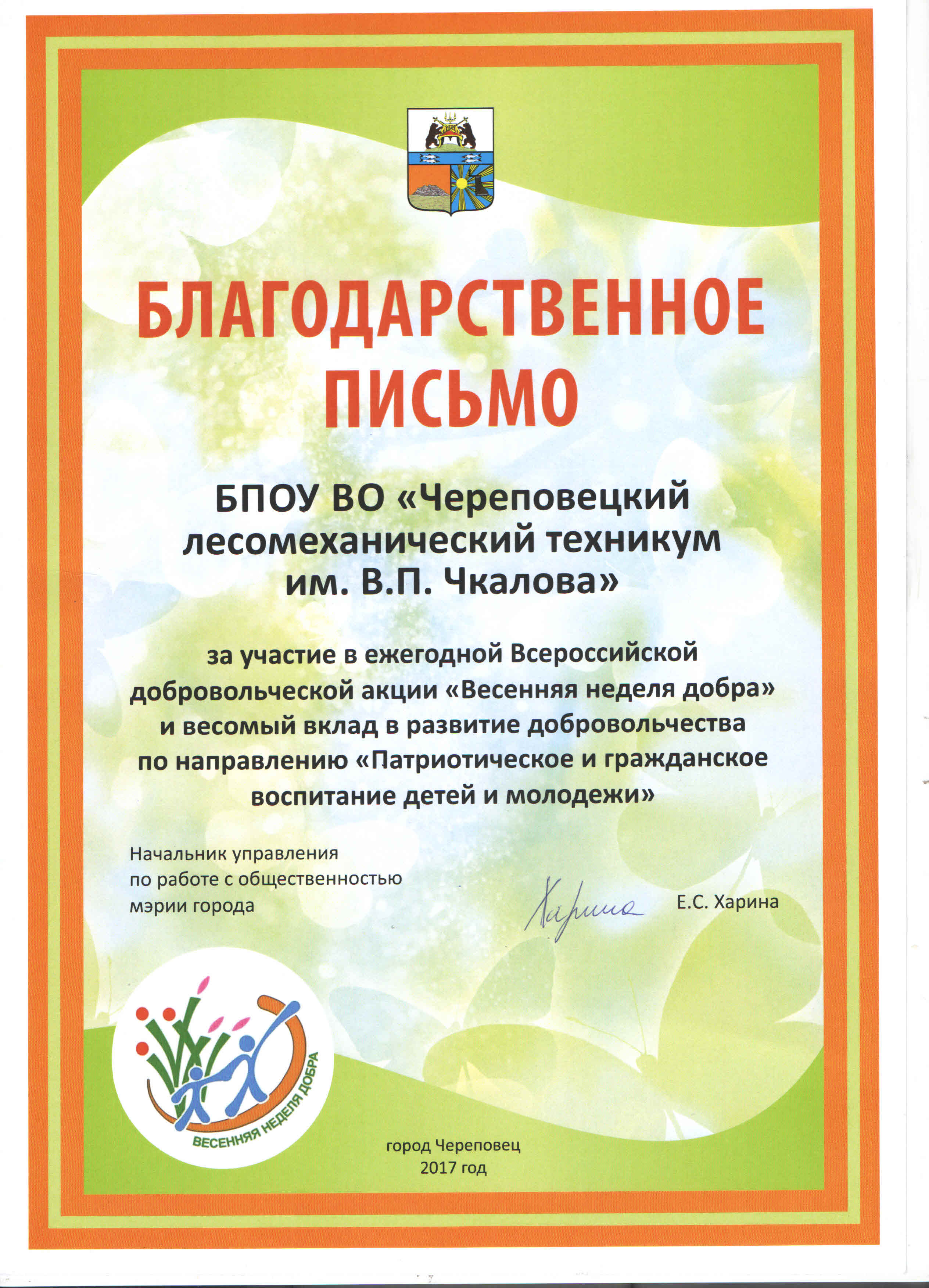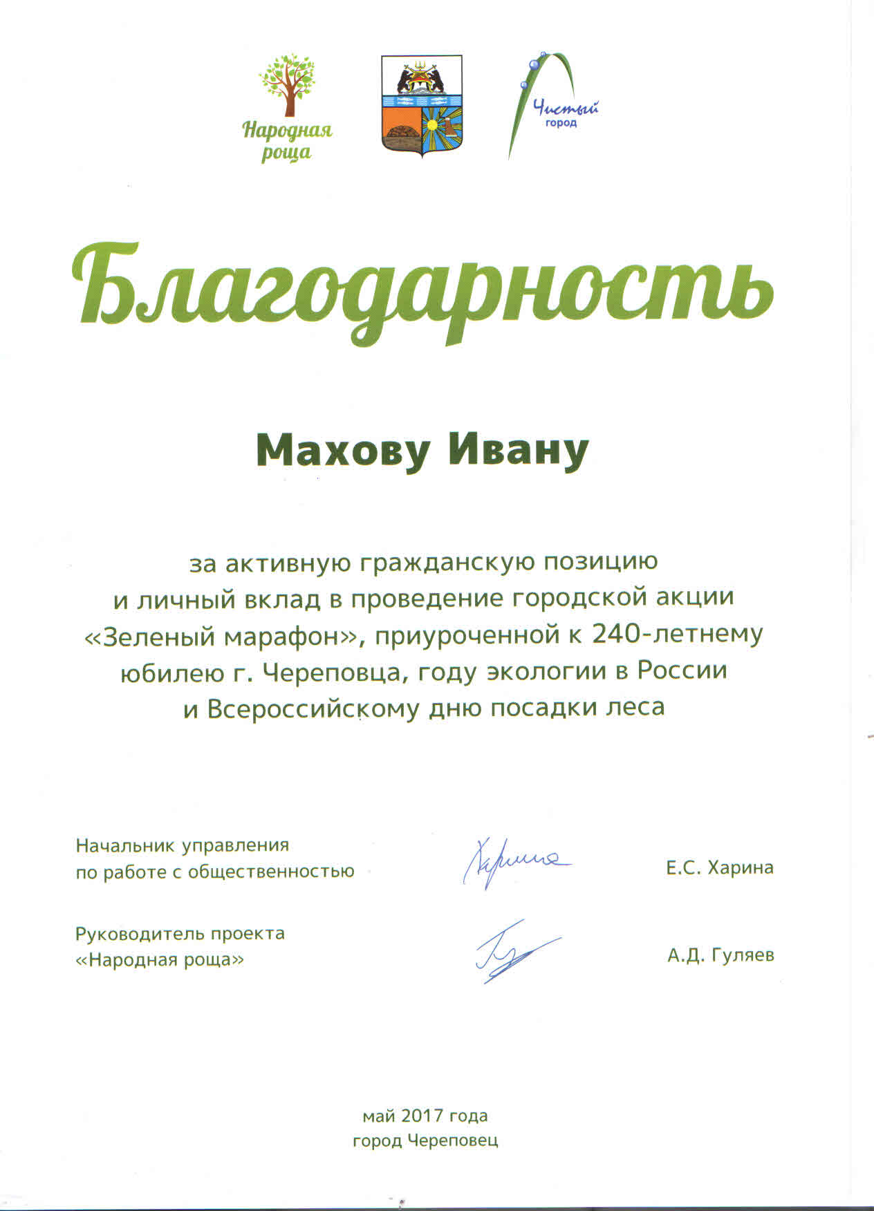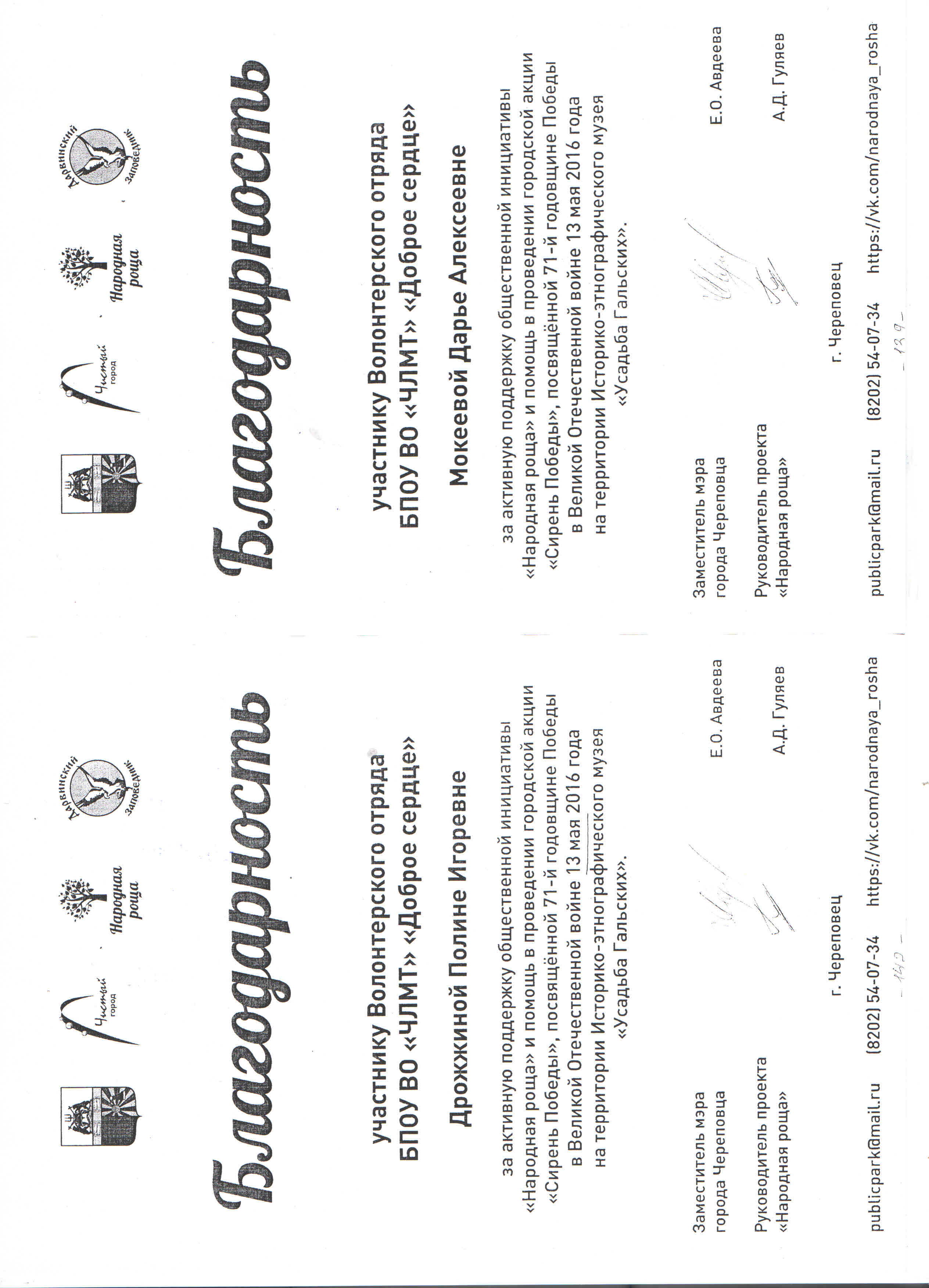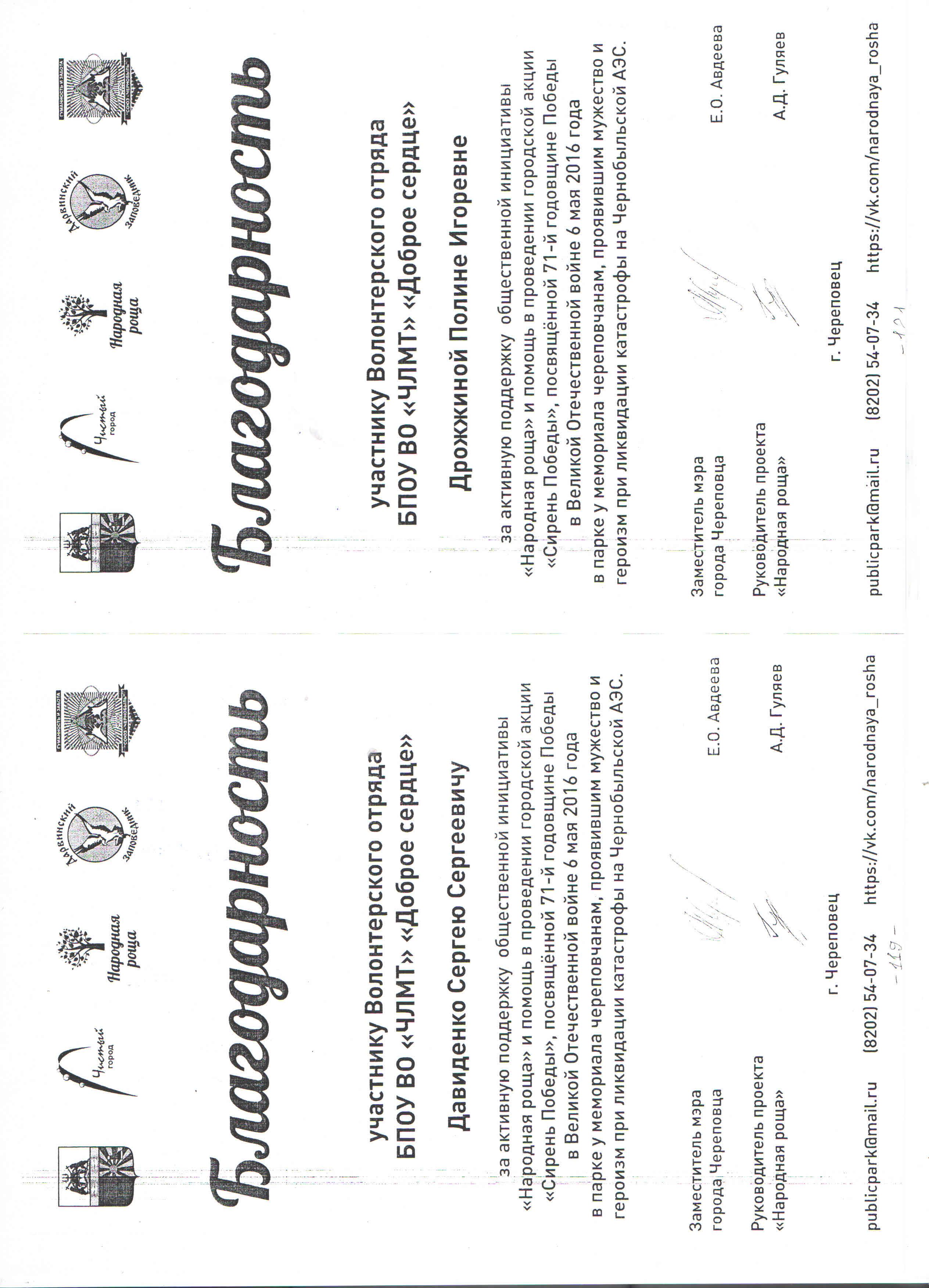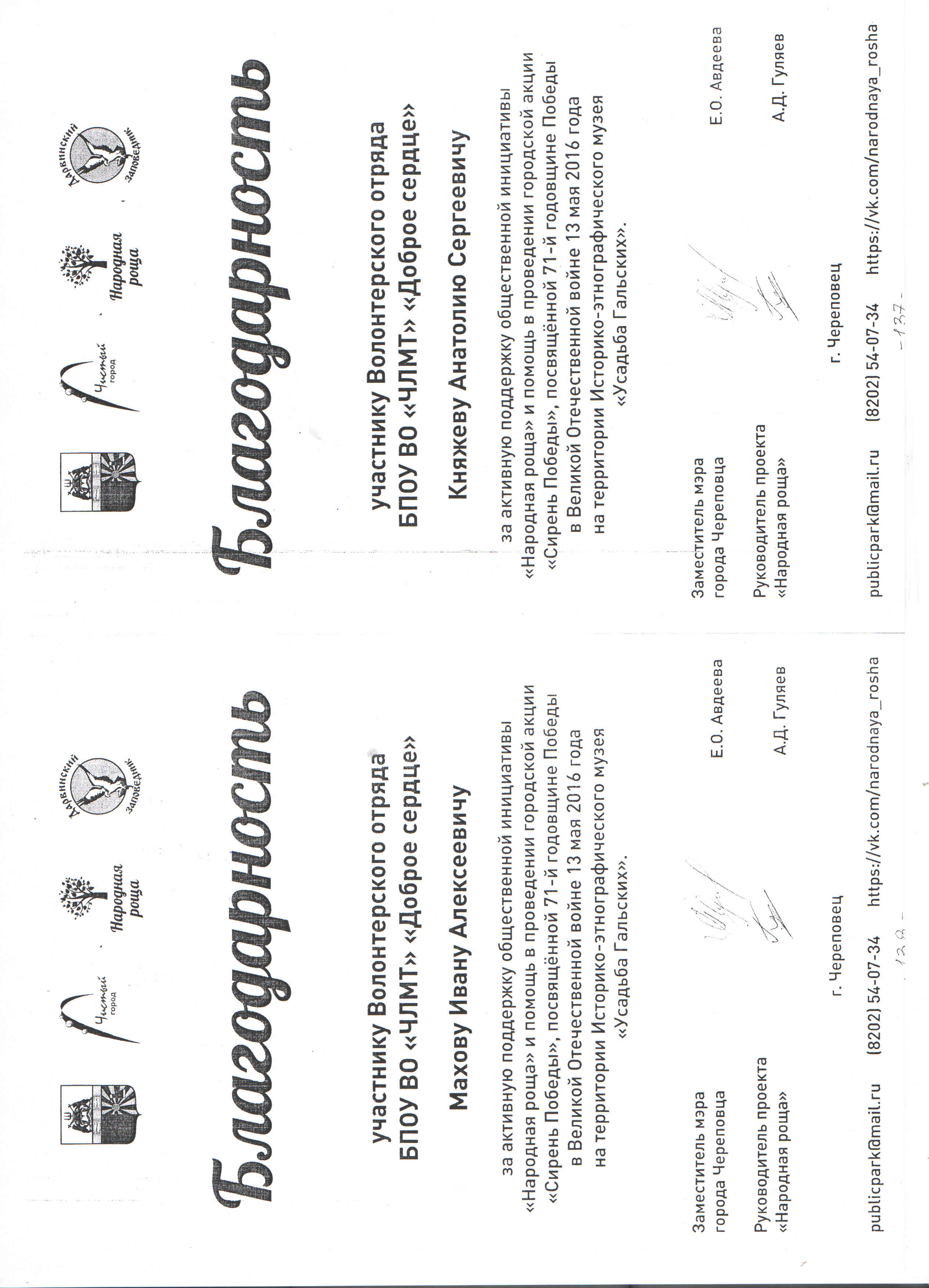 Накануне праздника отряду вручена благодарность мэрии Череповца за активное участие в общегородских субботниках по озеленению и благоустройству территории города.