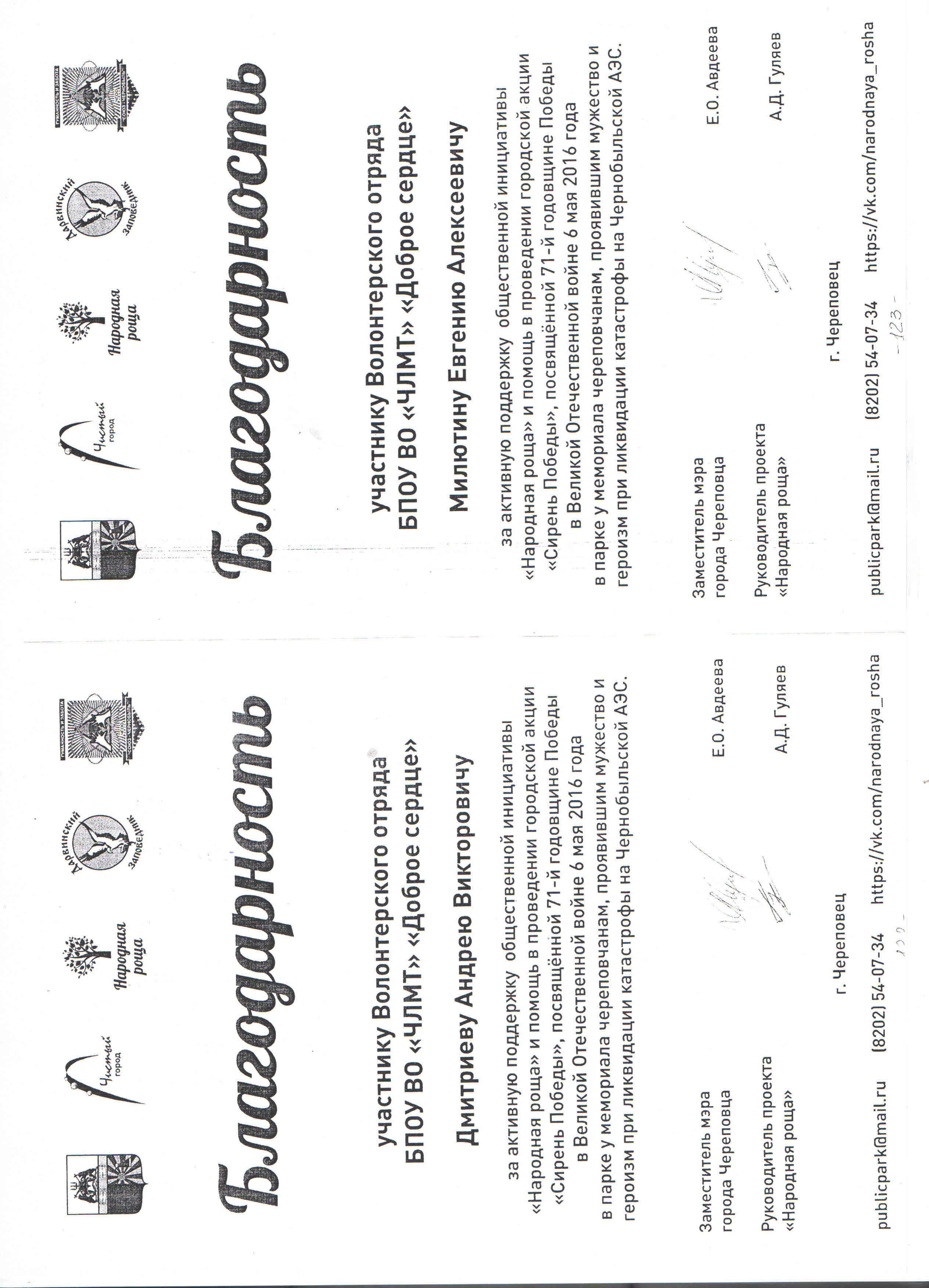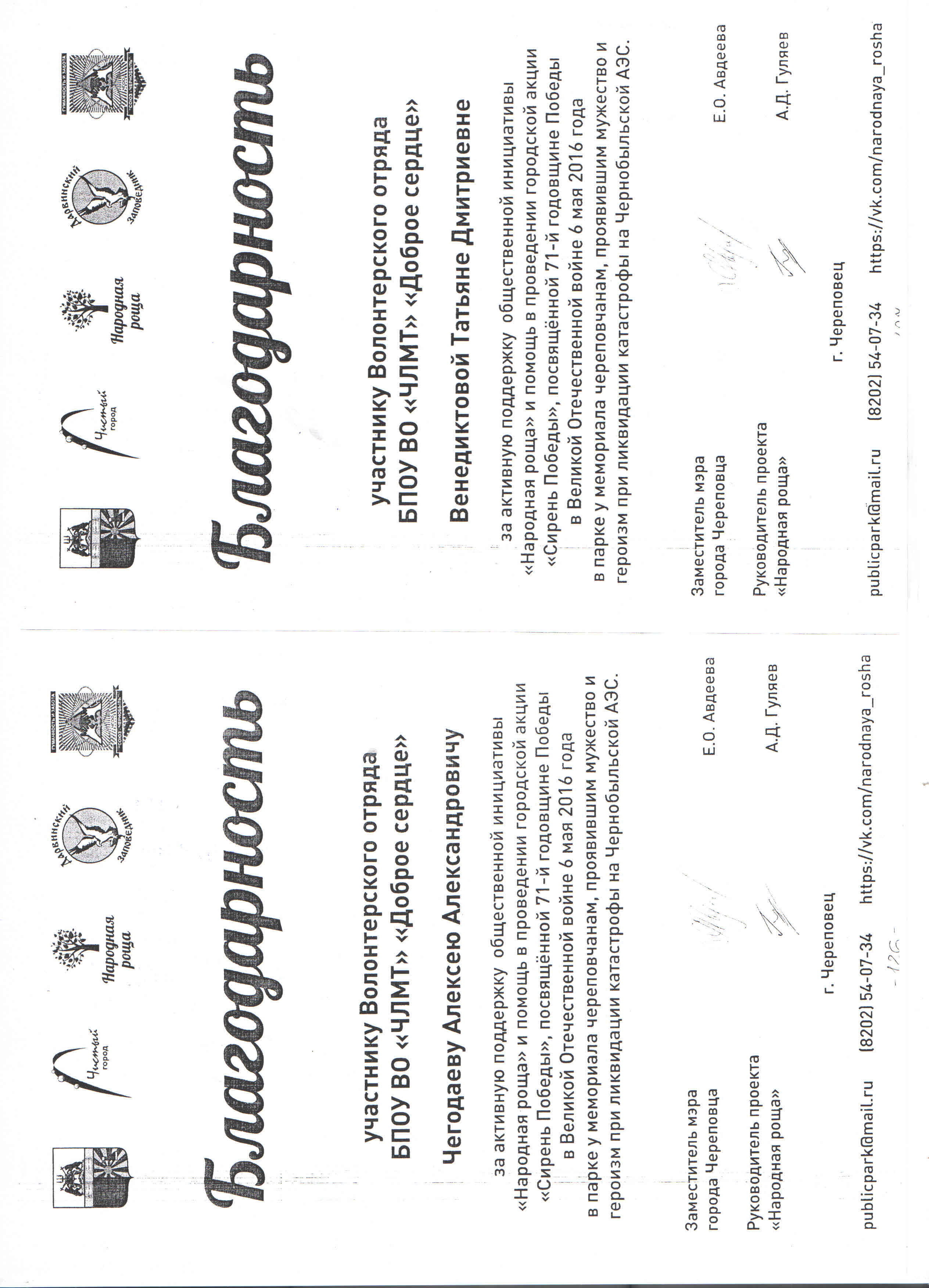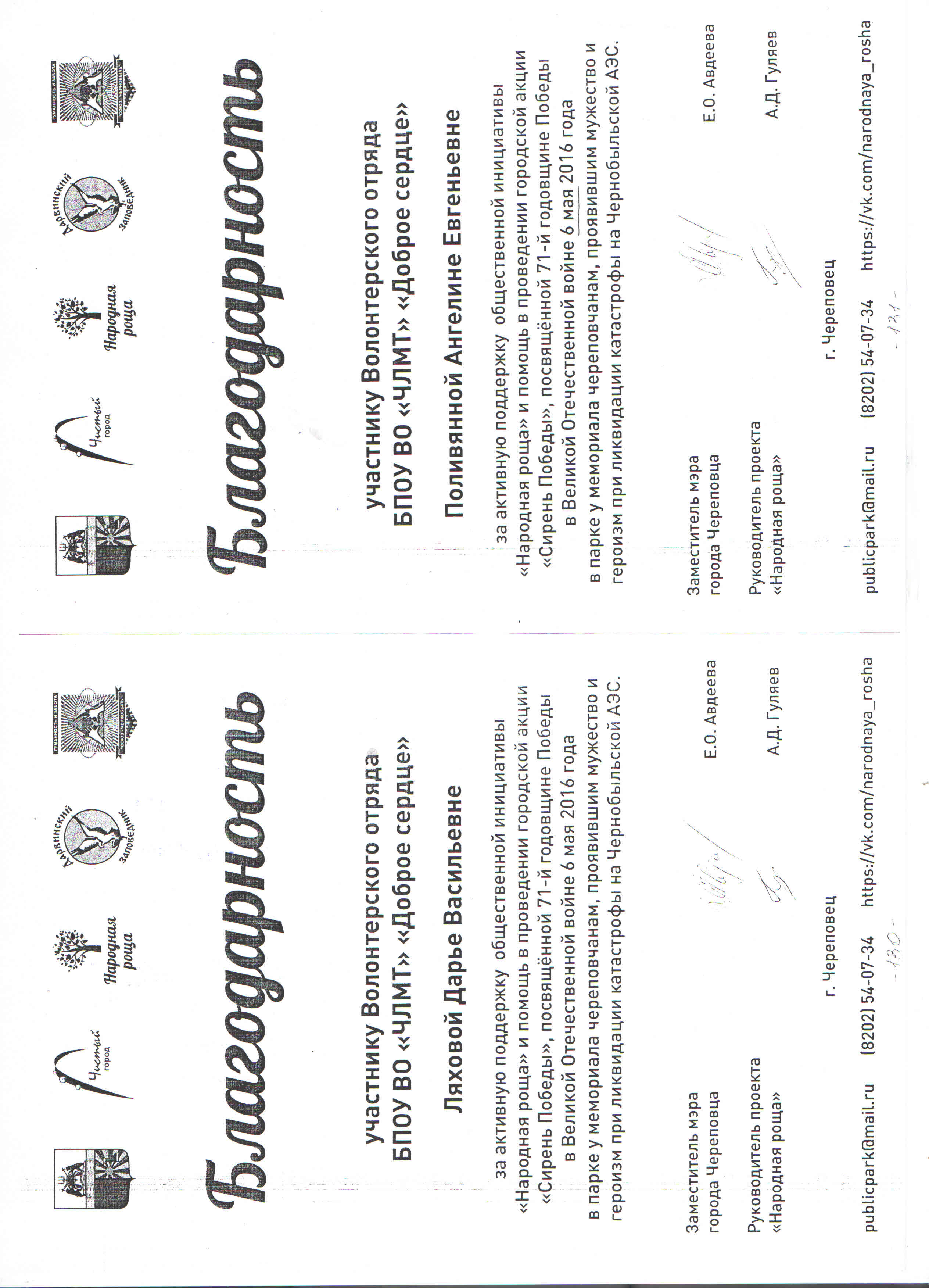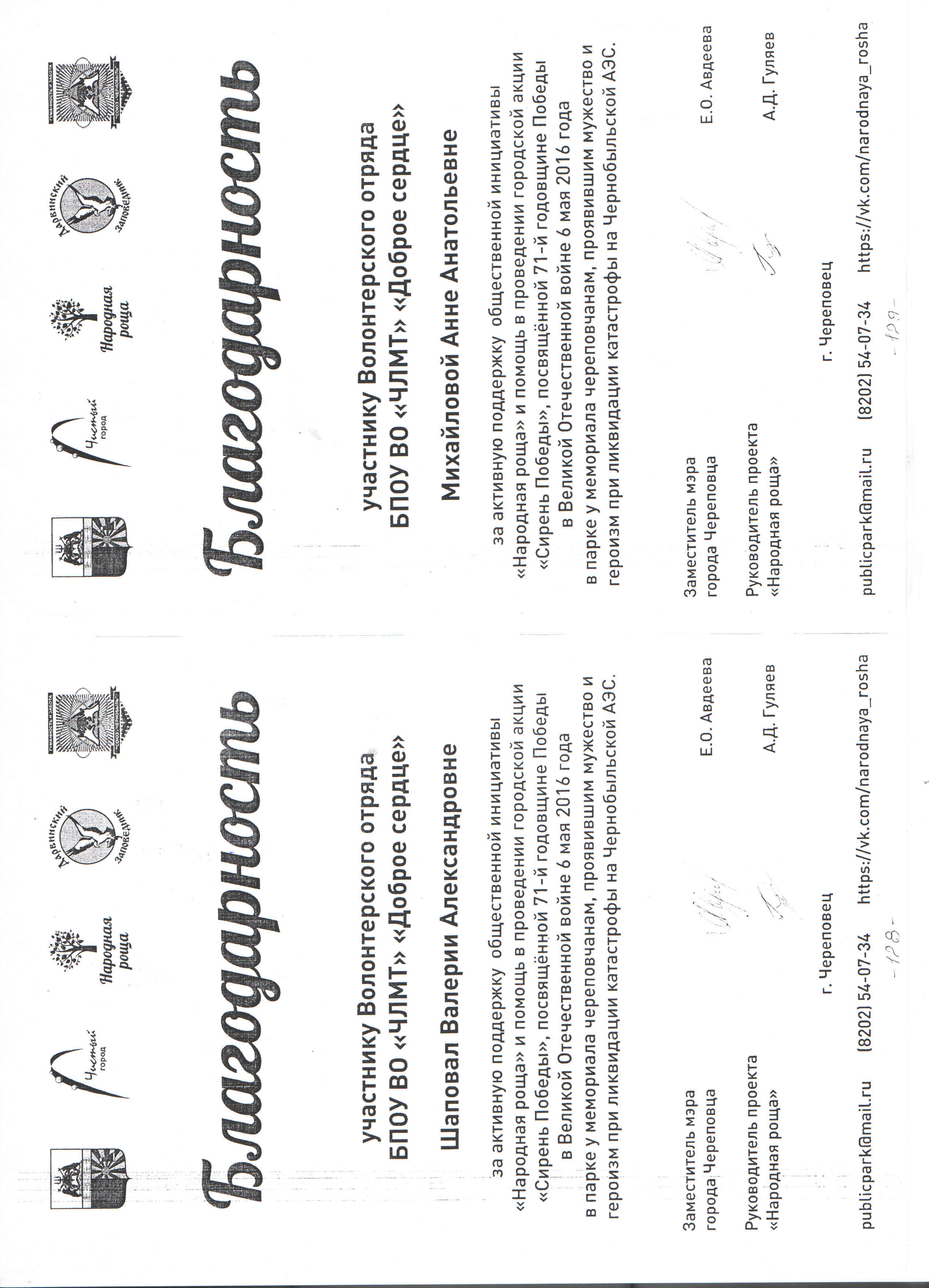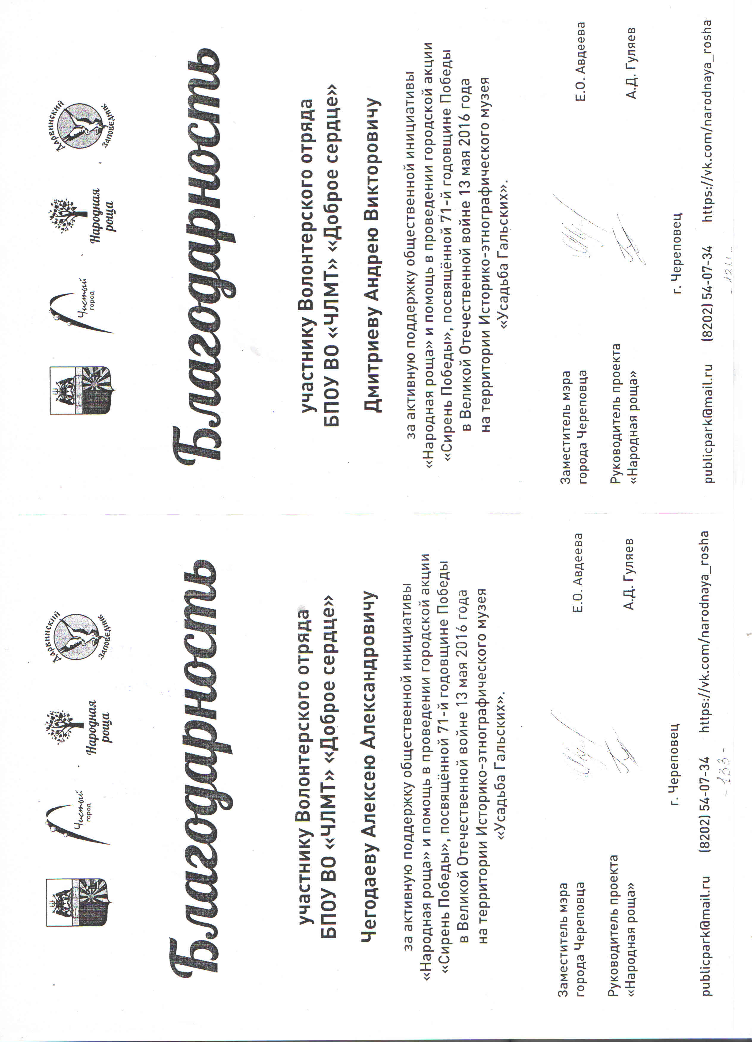 Накануне праздника отряду вручена благодарность мэрии Череповца за активное участие в общегородских субботниках по озеленению и благоустройству территории города.