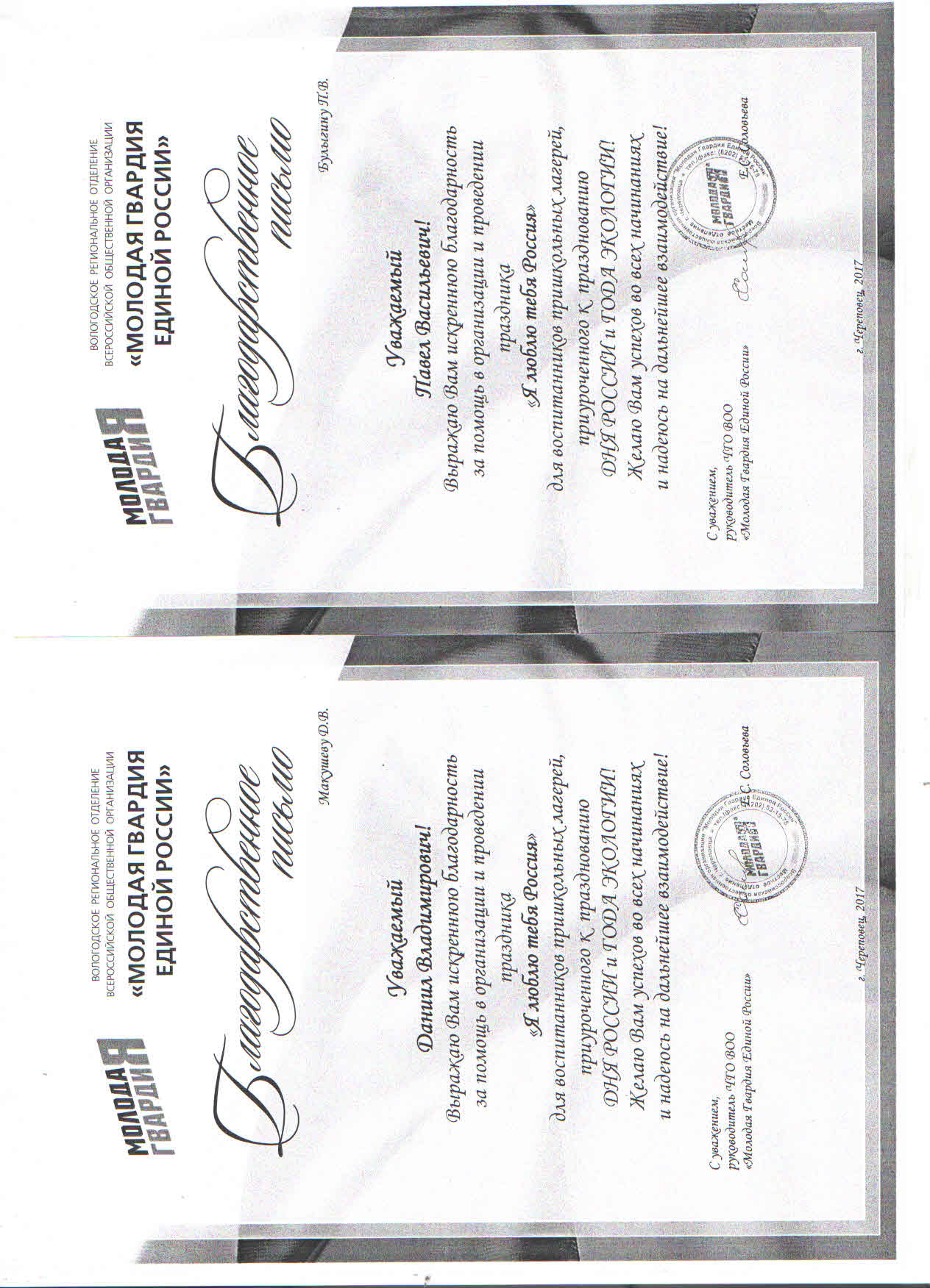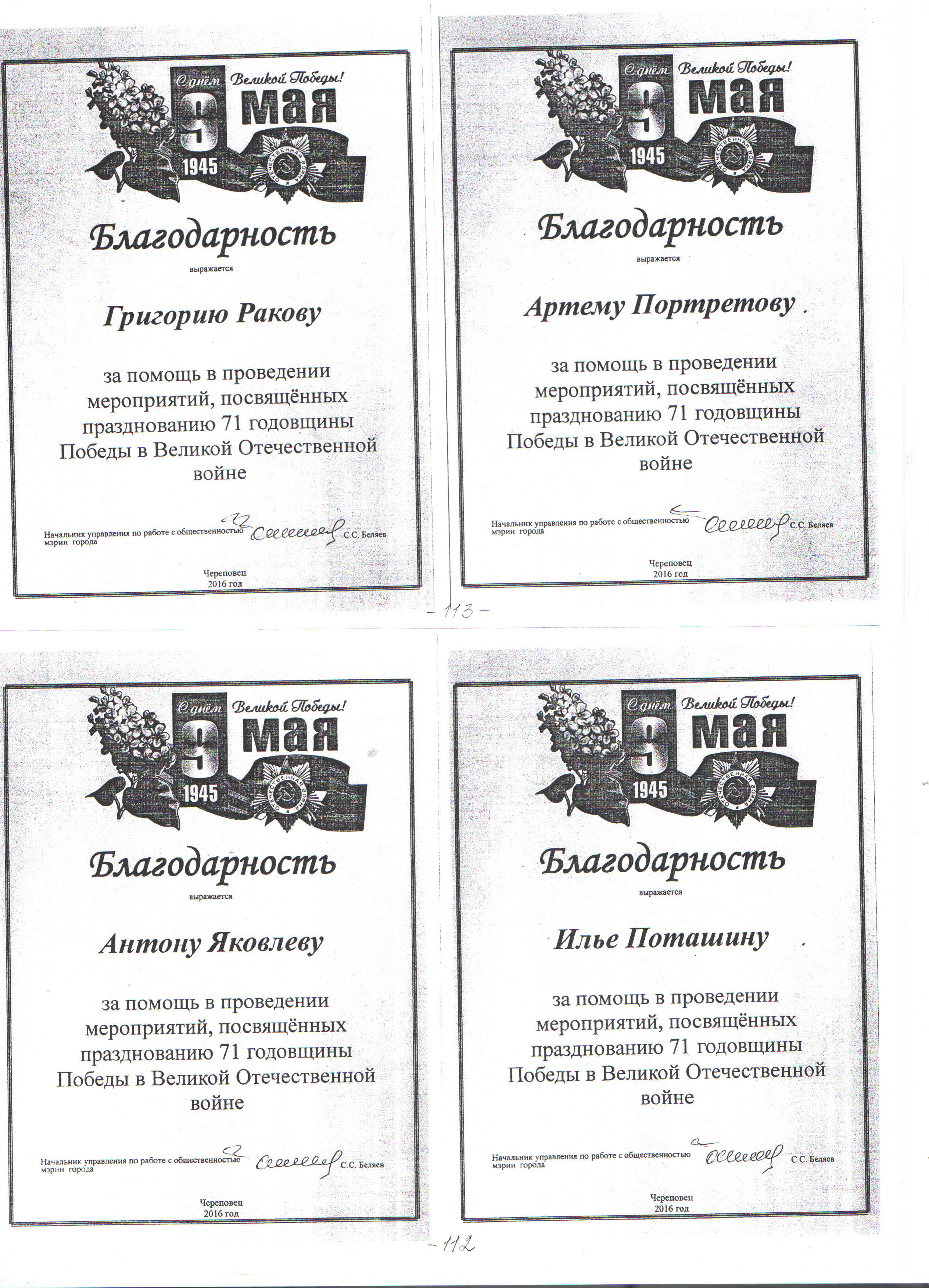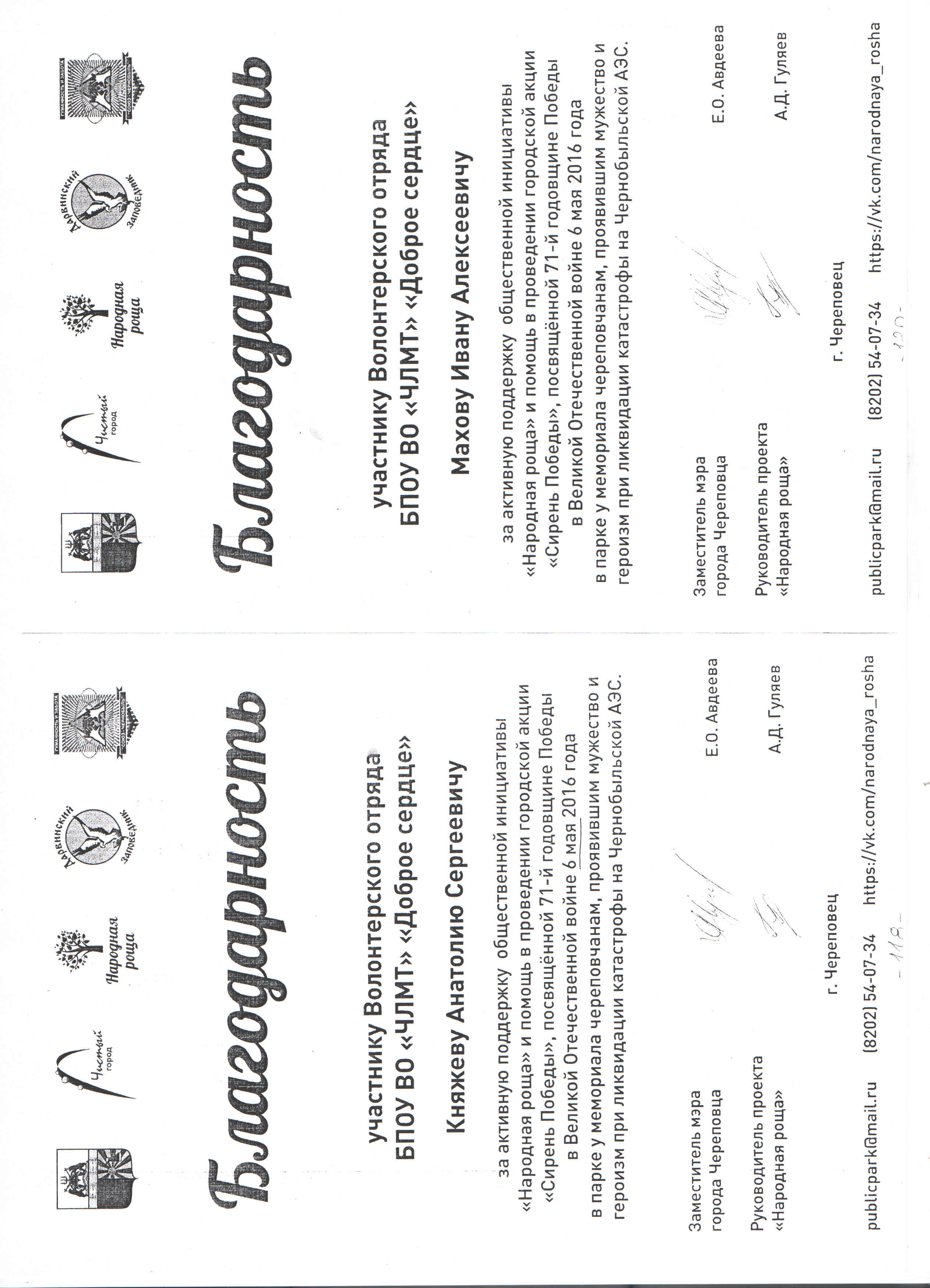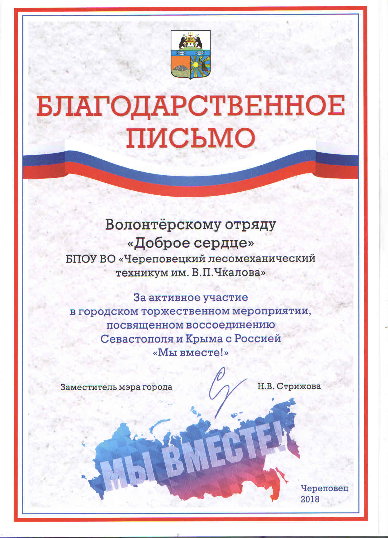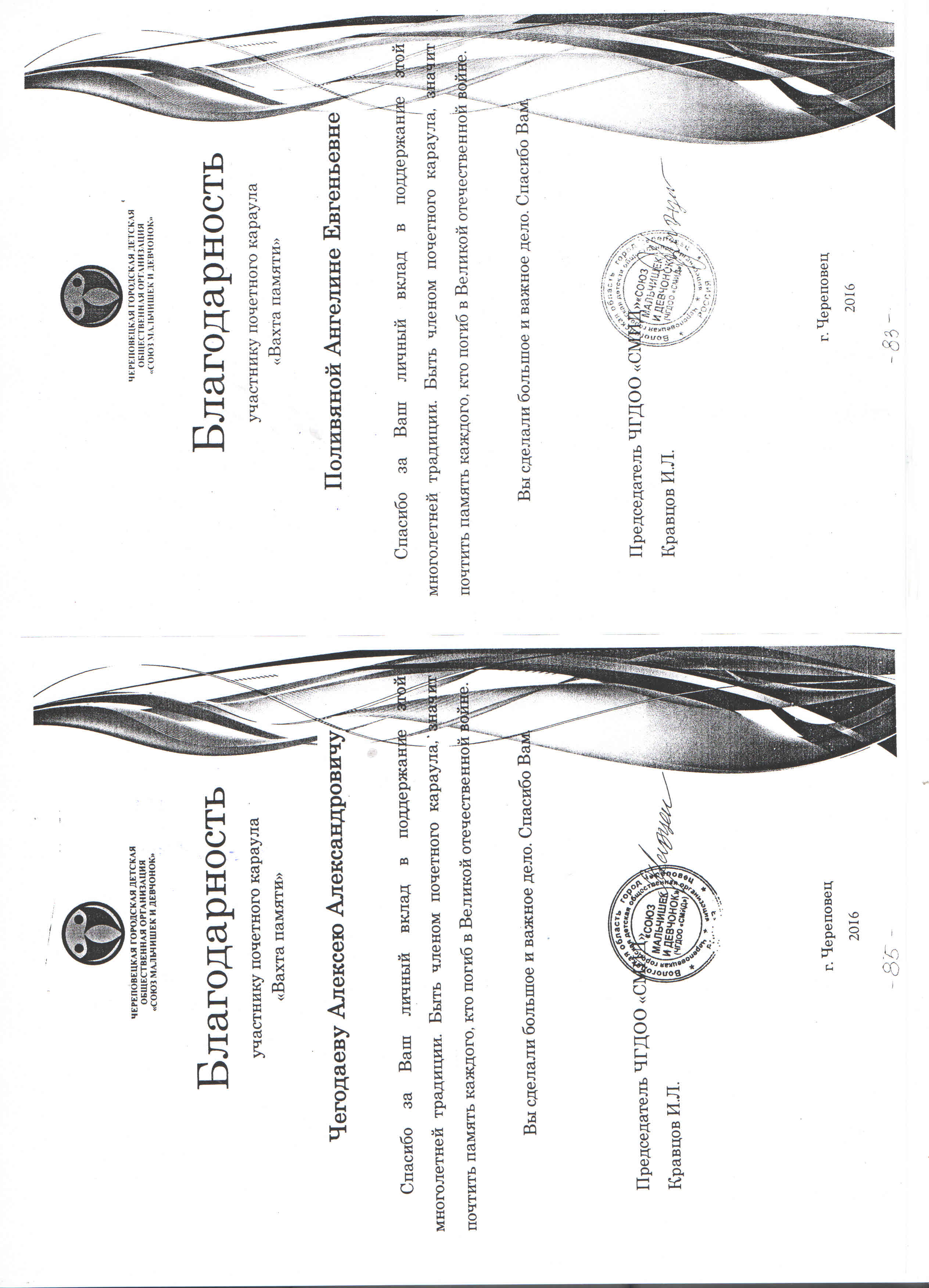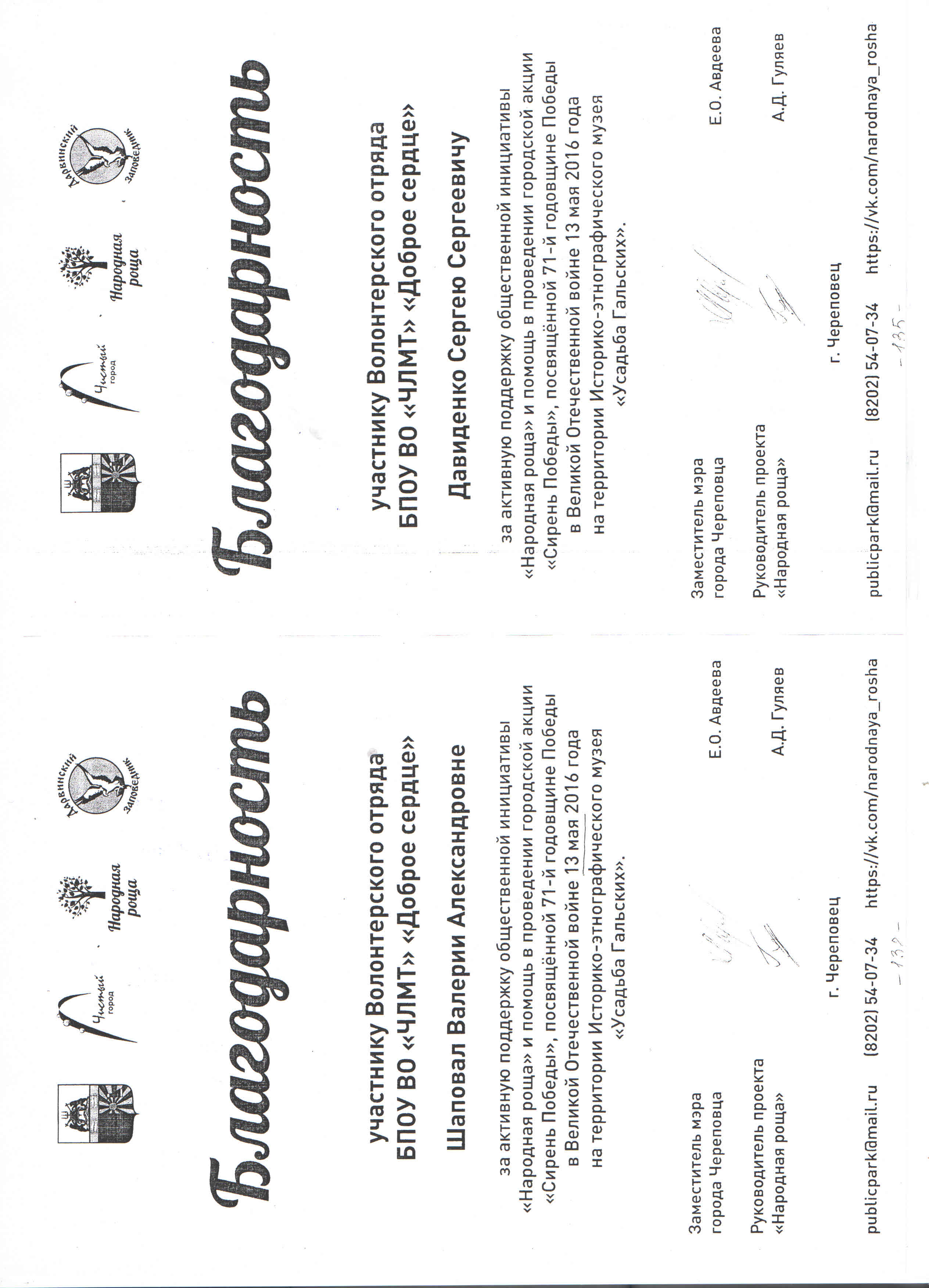 Накануне праздника отряду вручена благодарность мэрии Череповца за активное участие в общегородских субботниках по озеленению и благоустройству территории города.