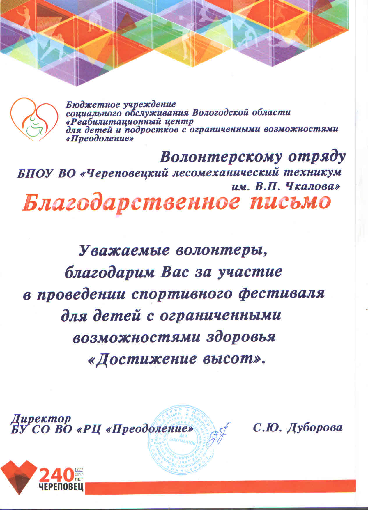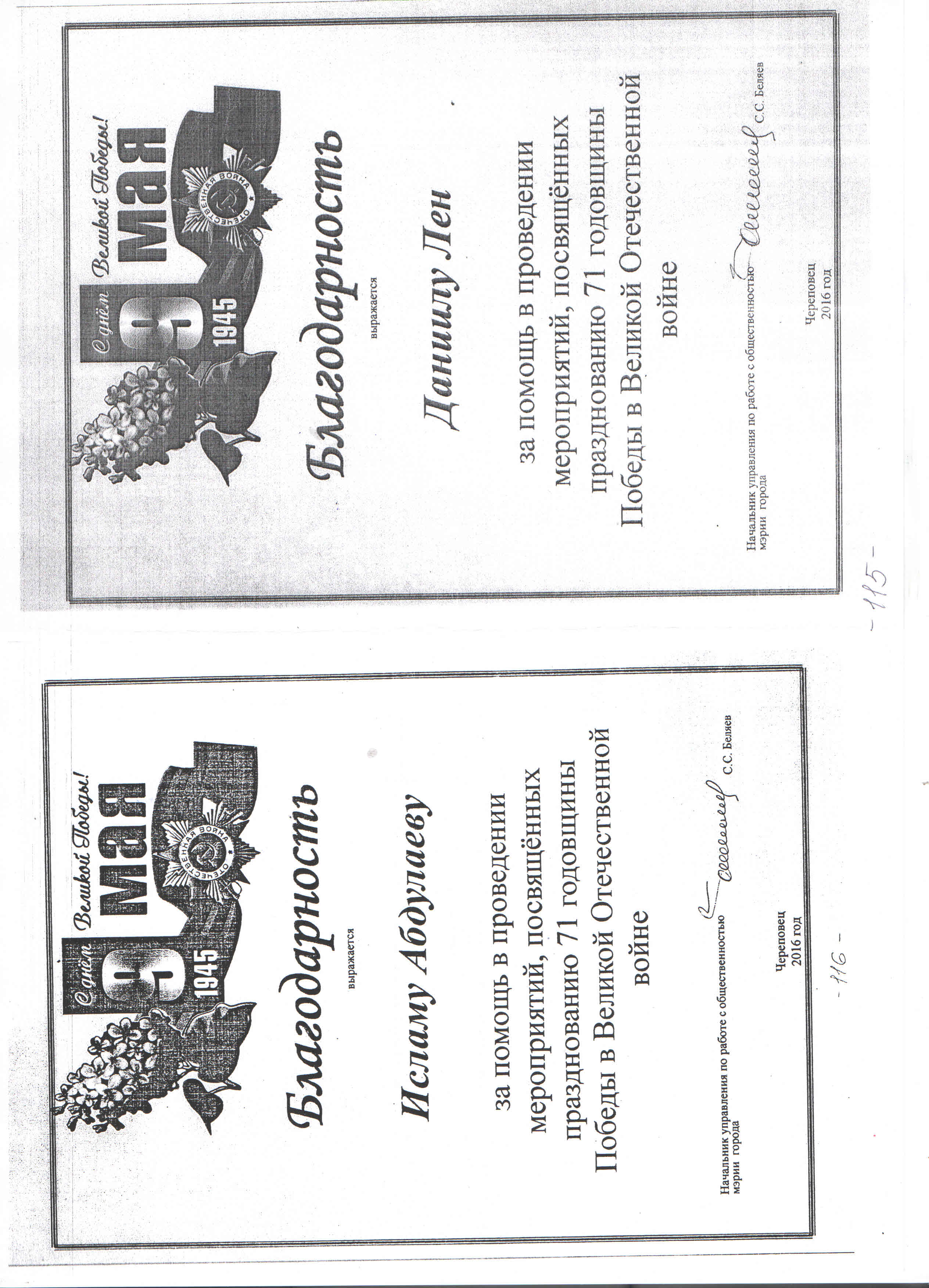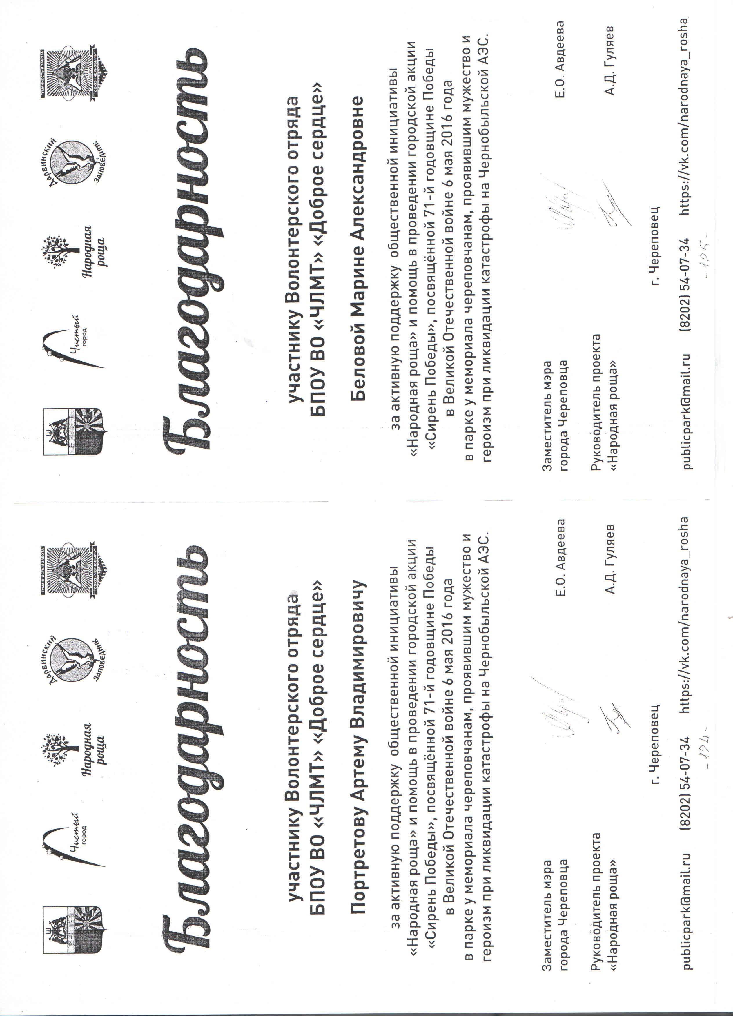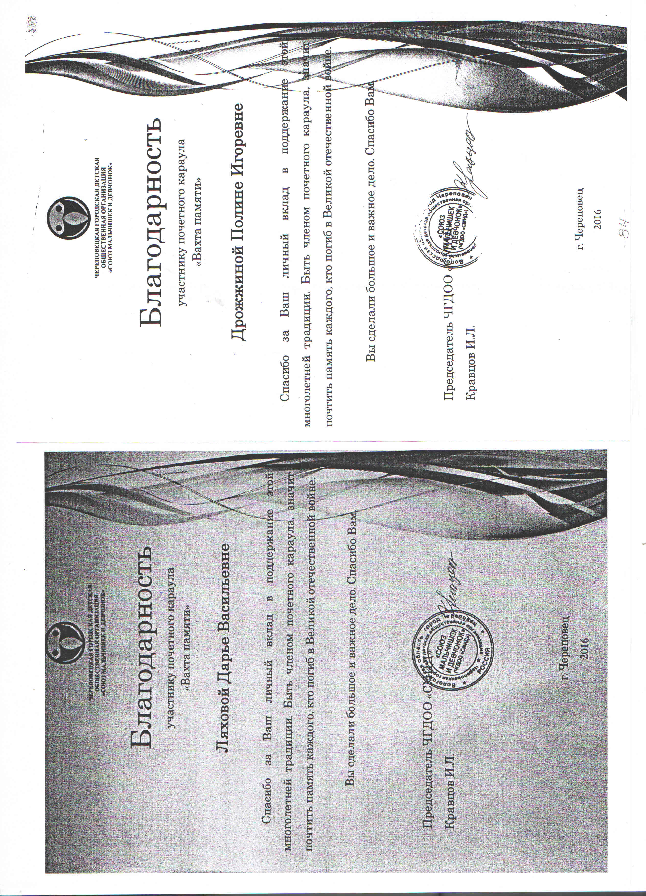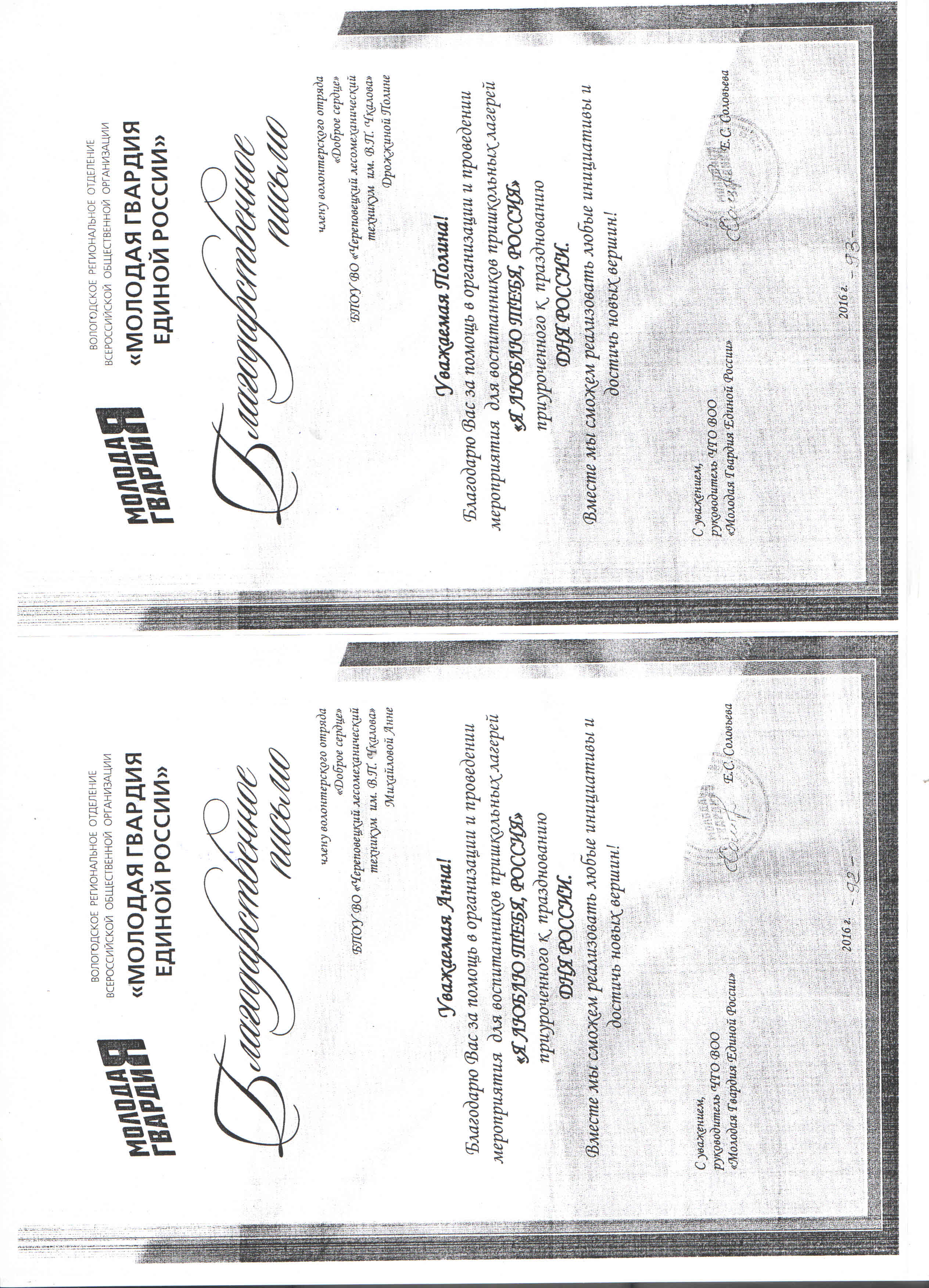 Накануне праздника отряду вручена благодарность мэрии Череповца за активное участие в общегородских субботниках по озеленению и благоустройству территории города.