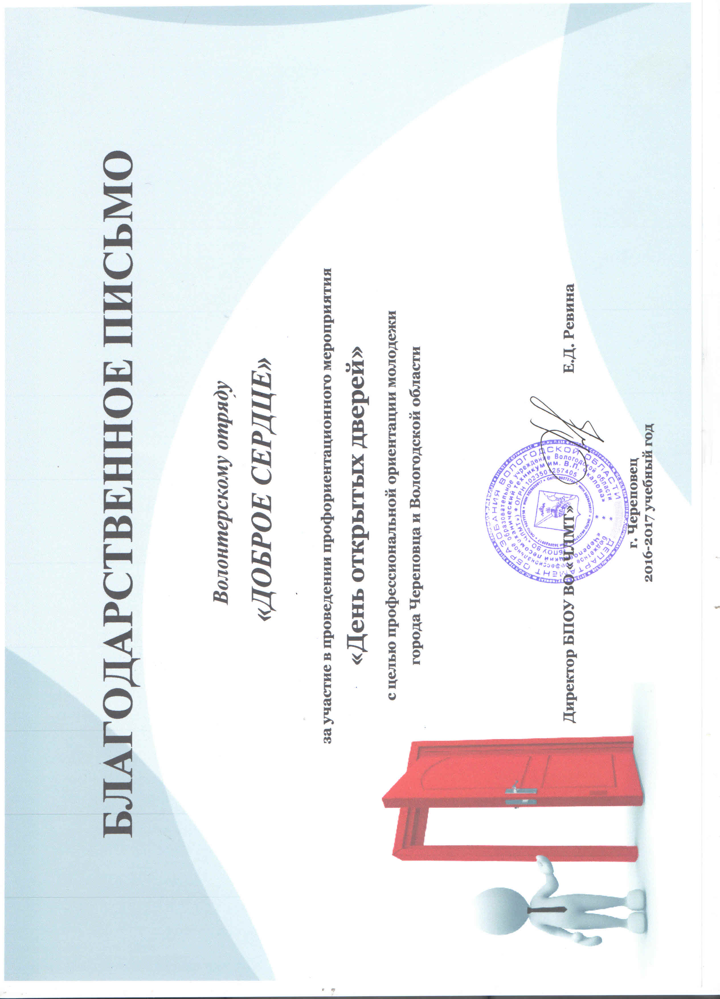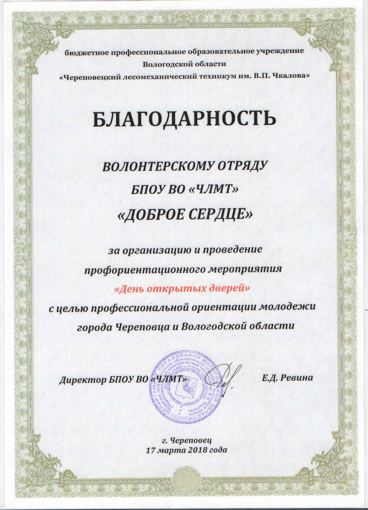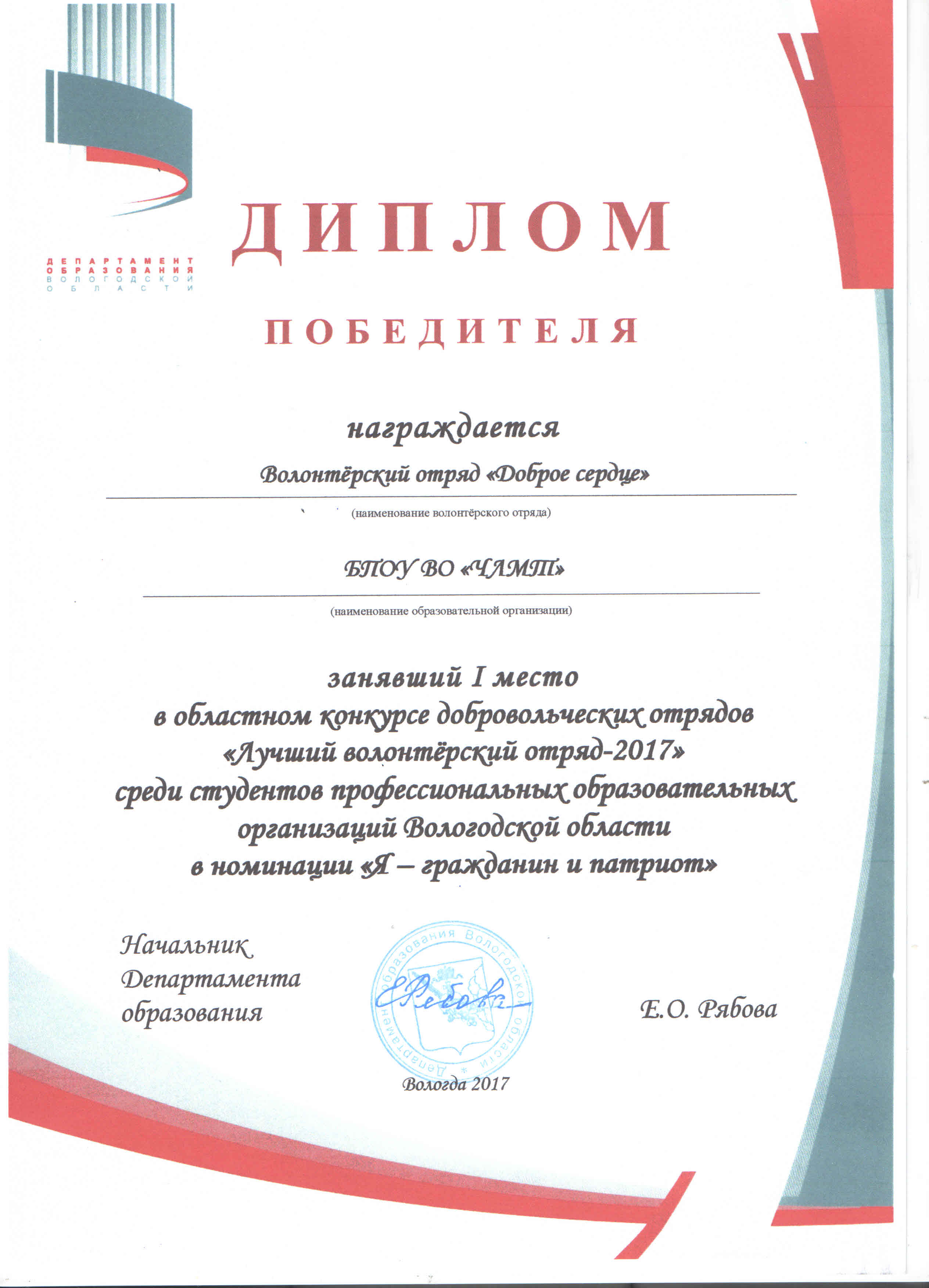 нтёрский отряд – 2018», интерактивные мастер-классы по направлениям добровольчества: экология, патриотизм, решение конфликтных ситуаций, медицинское волонтёрство, обучение работе в Единой информационной системе Добровольцы России. Волонтёрский отряд БПОУ ВО «ЧЛМТ» «Доброе сердце» был награждён за I место в номинации «Я такой же, как и ты!» (для добровольческих объединений поддержки лиц с ОВЗ и инвалидностью).