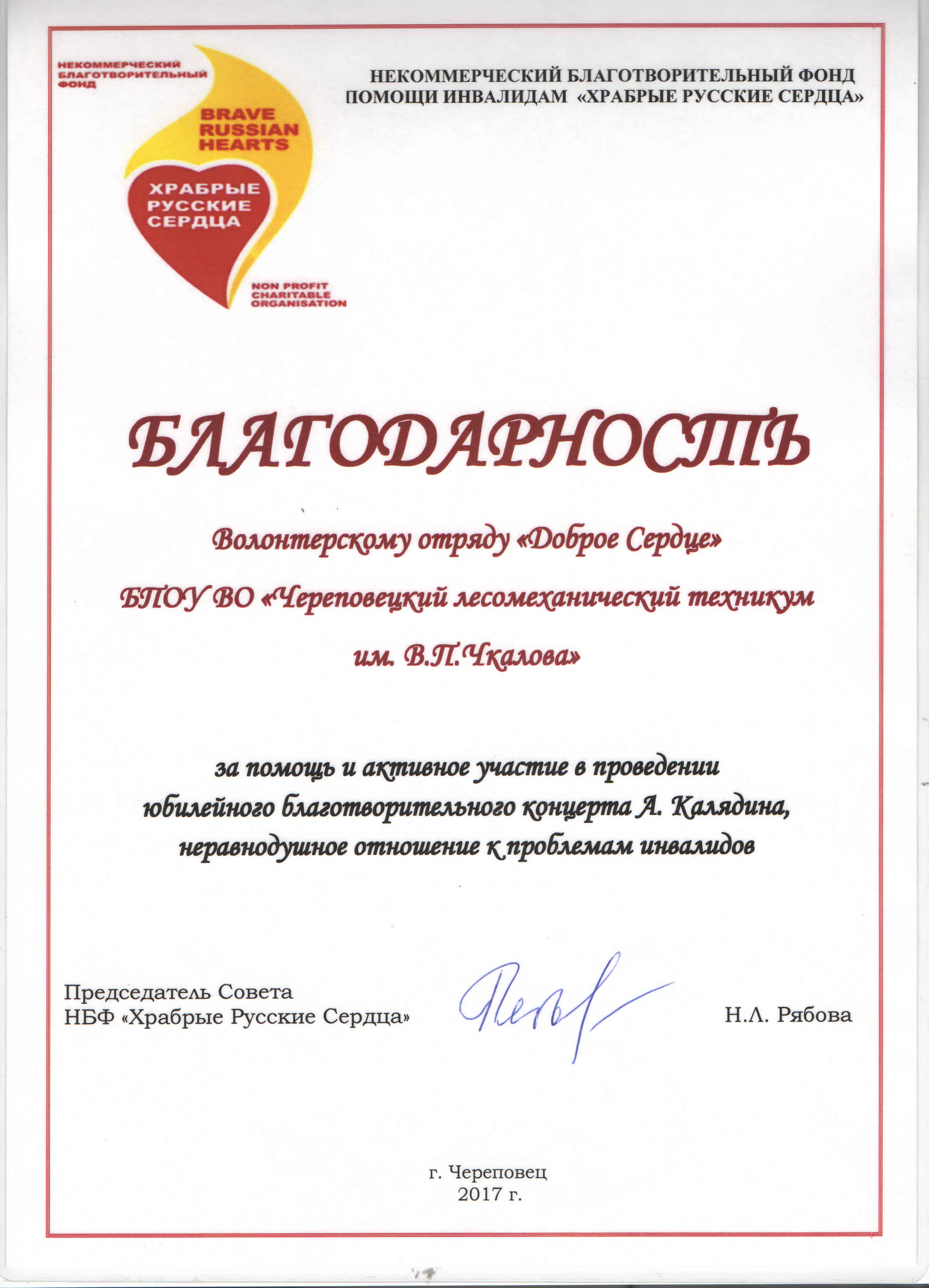 3 декабря 2018 года в МБУК "Дворец культуры металлургов" прошёл городской добровольческий форум, в котором приняли участие и члены волонтёрского отряда «Доброе сердце» БПОУ ВО «ЧЛМТ». В рамках форума состоялась добровольческая выставка общественных организаций; подведение итогов работы за год и награждение лучших добровольцев и добровольческих организаций нашего города. Завершился форум праздничным концертом, посвященным Международному дню Добровольца.