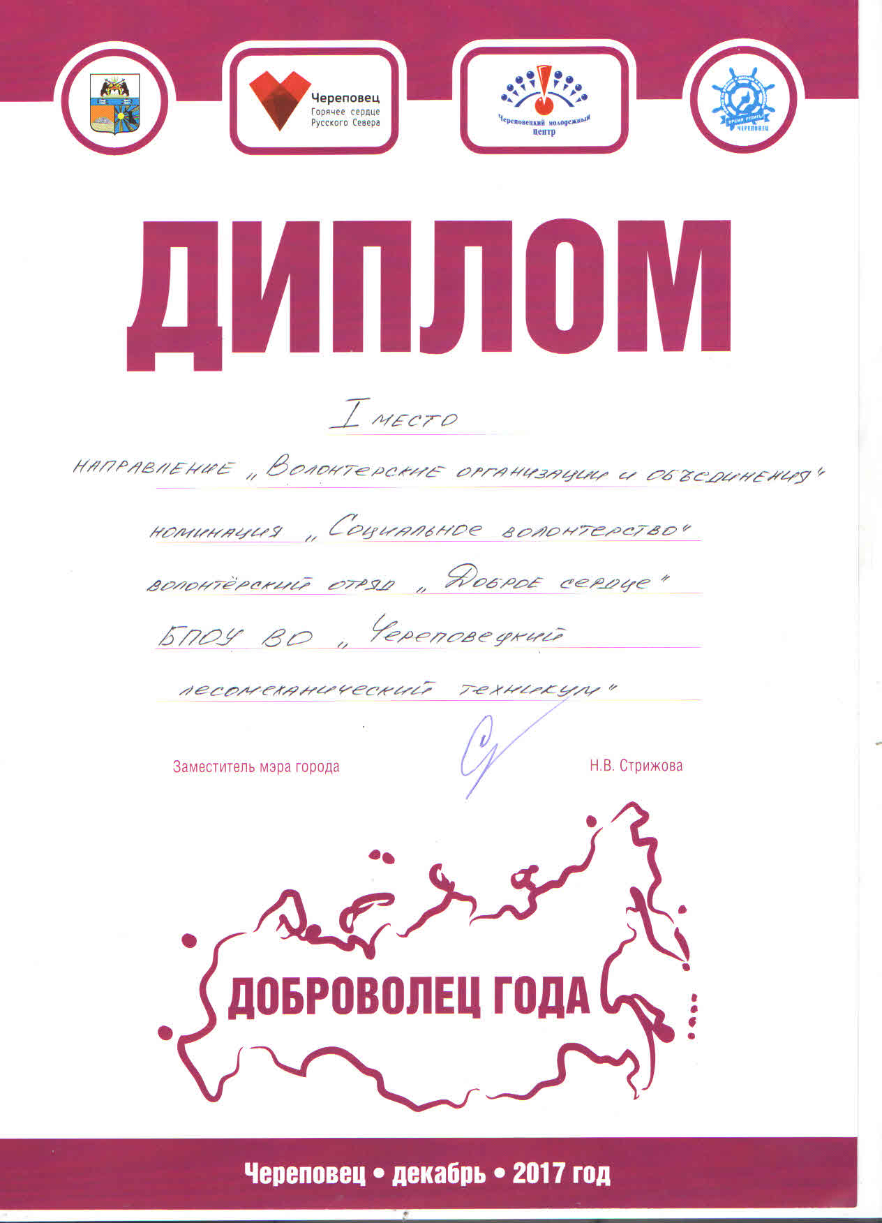 13.12.2017 г. в МКУ "Череповецкий молодёжный центр" состоялось подведение итогов городского конкурса "Доброволец года". Волонтёрский отряд "Доброе сердце" техникума награждён дипломом I степени в направлении "Волонтёрские организации и объединения" в номинации "Социальное волонтёрство". Поздравляем всех членов отряда. Молодцы!