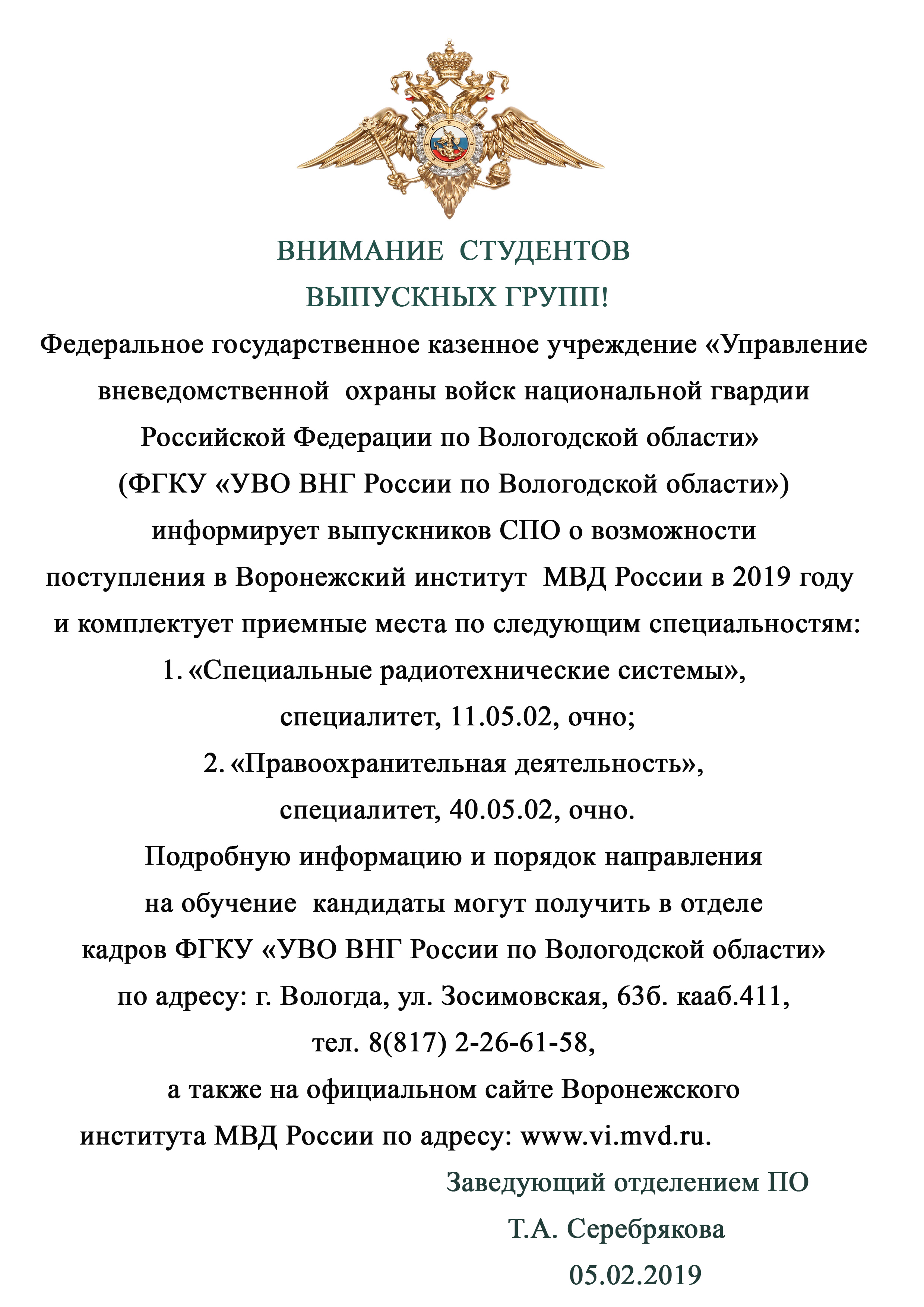 Выпускники техникума имеют возможность поступления в ведущие ВУЗы Российской Федерации и Вологодской области для получения высшего образования.
