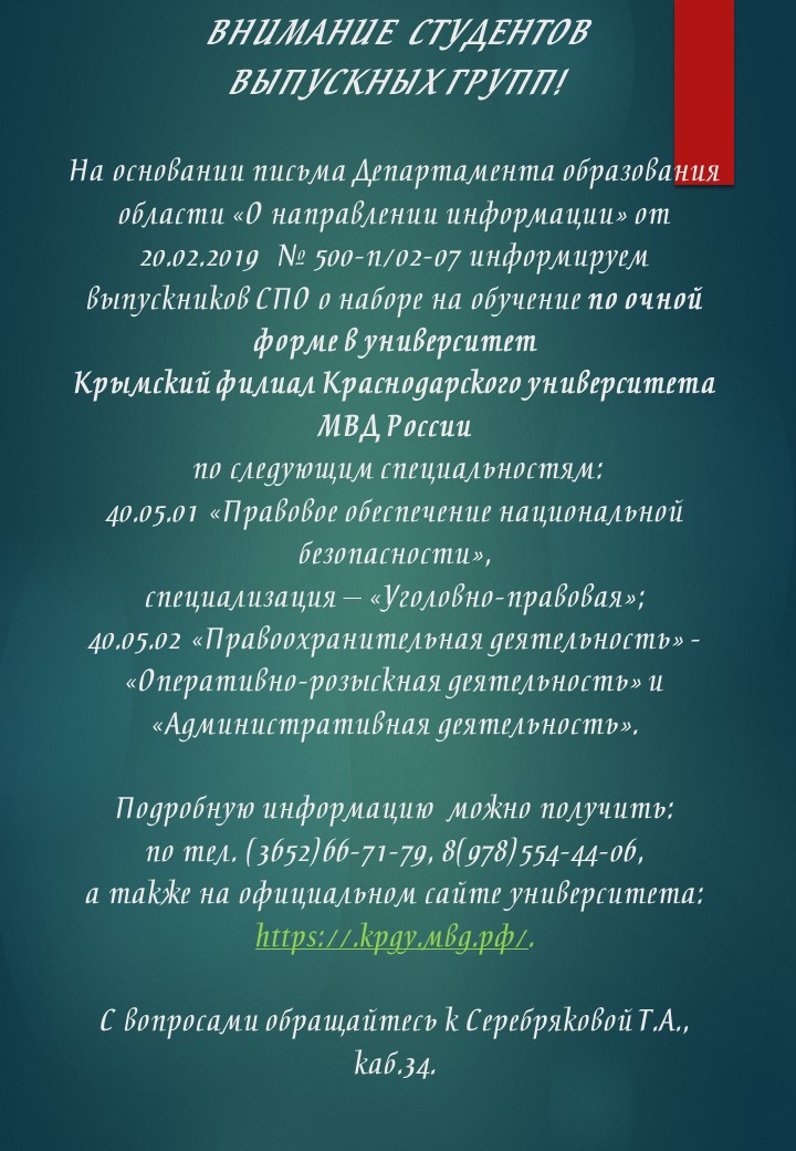 По всем специальностям в техникуме существует система продолжения образования по сокращенным срокам.